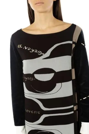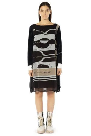 Black organza long-sleeved knee-length dress with black petticoat. Contrasting white and beige print of car and ‘EC.lovers.voyagers’ inscription.