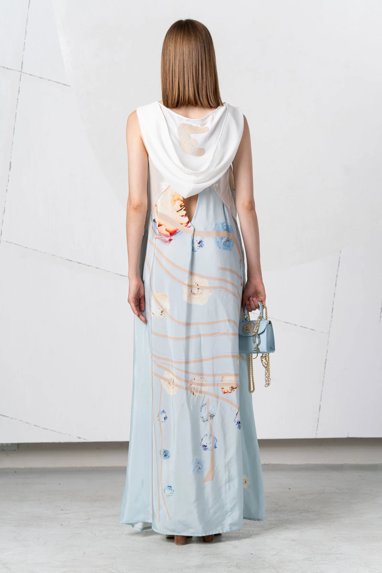 Light blue long dress with rose print. V-neckline. Removable white georgette hood with decorative buttons on straps and with light dots.