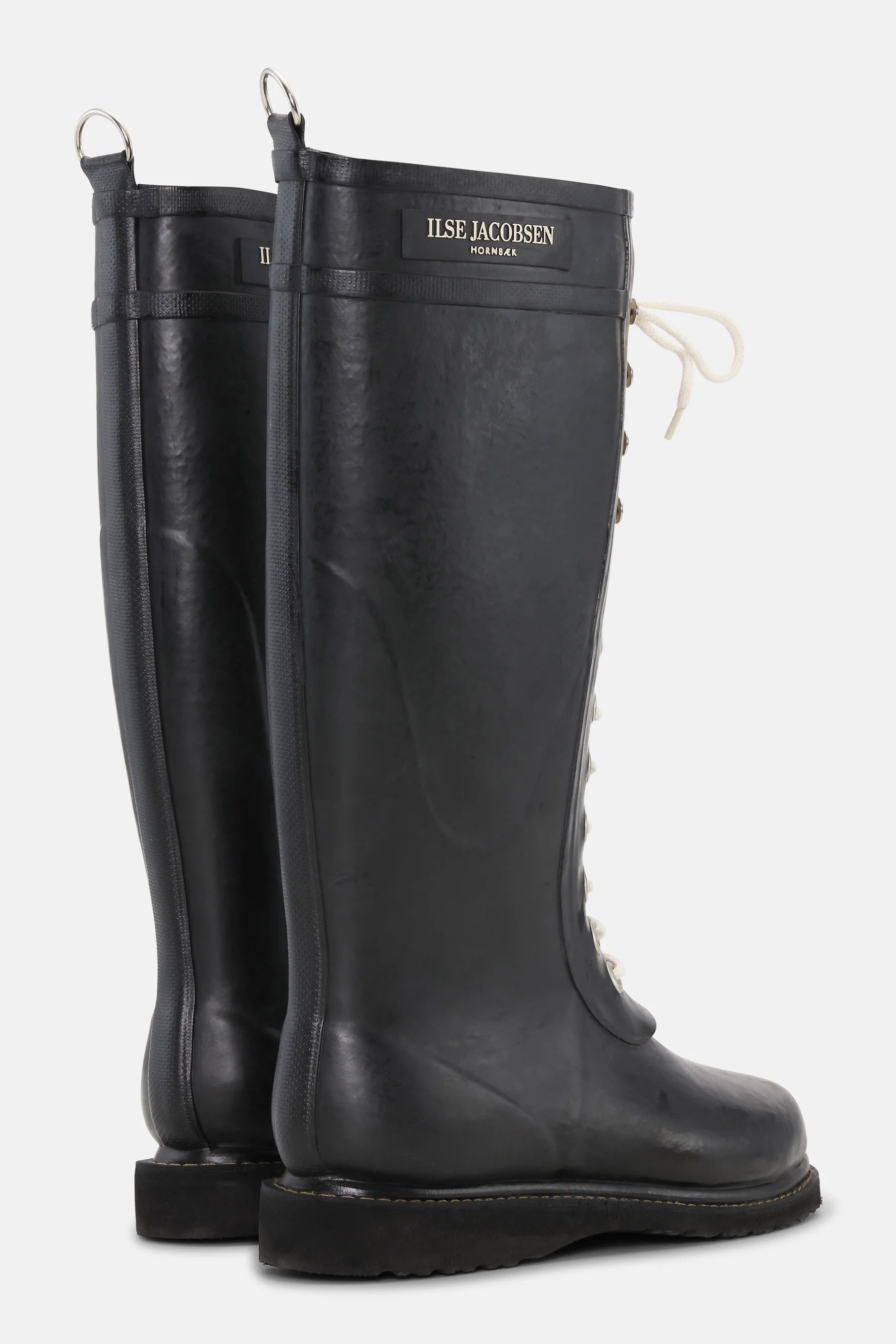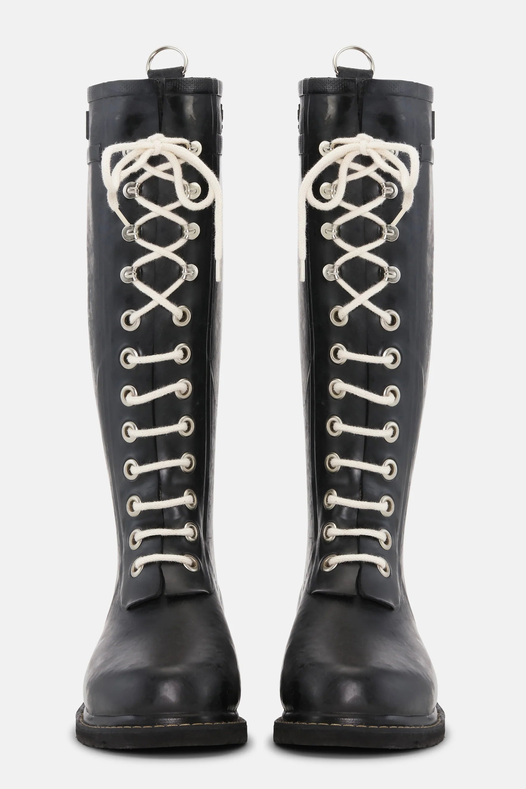 The iconic laced rubber boots by ILSE JACOBSEN HORNBÆK. These knee length rain boots feature a decorative D-ring at center back and logo on the shaft.
