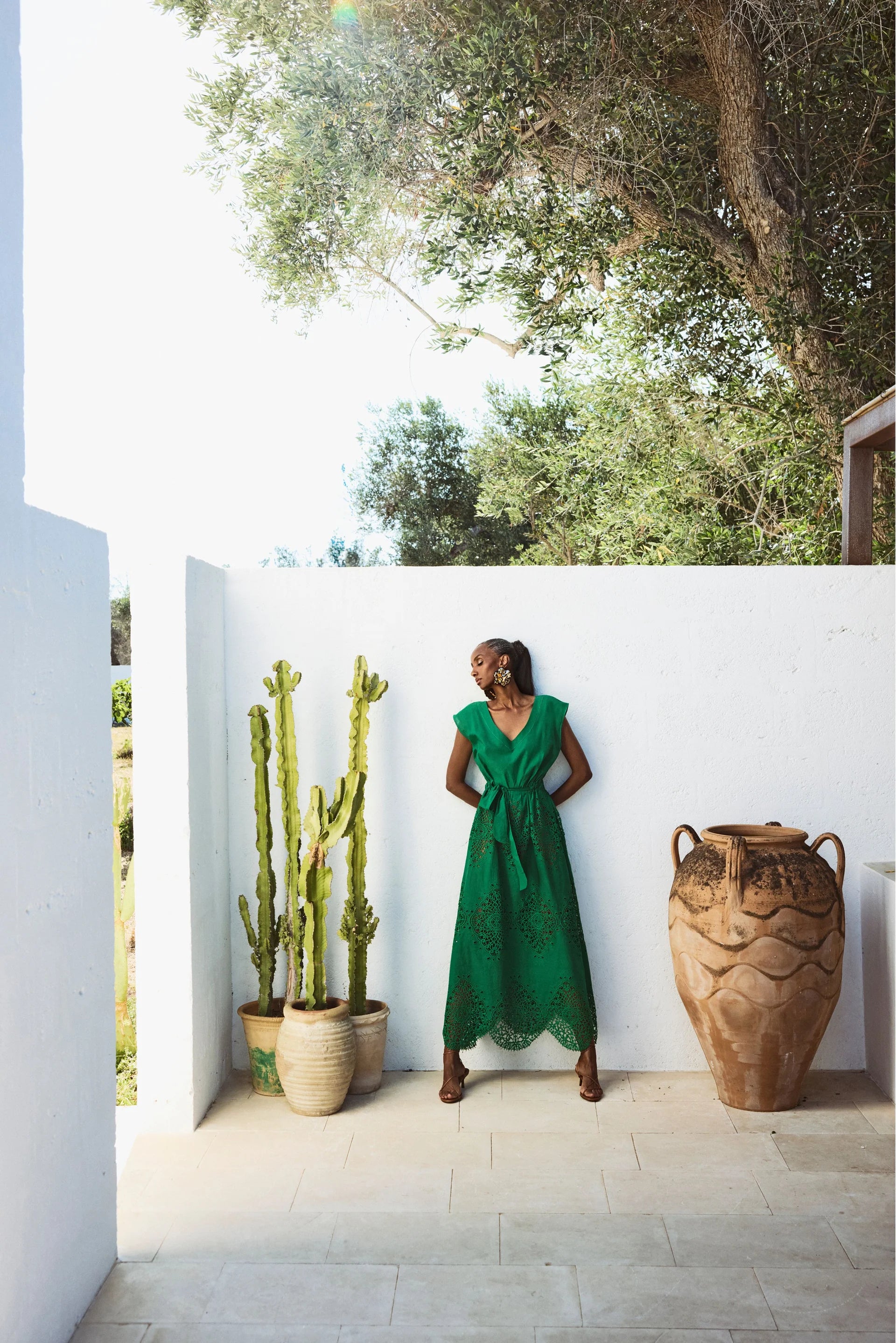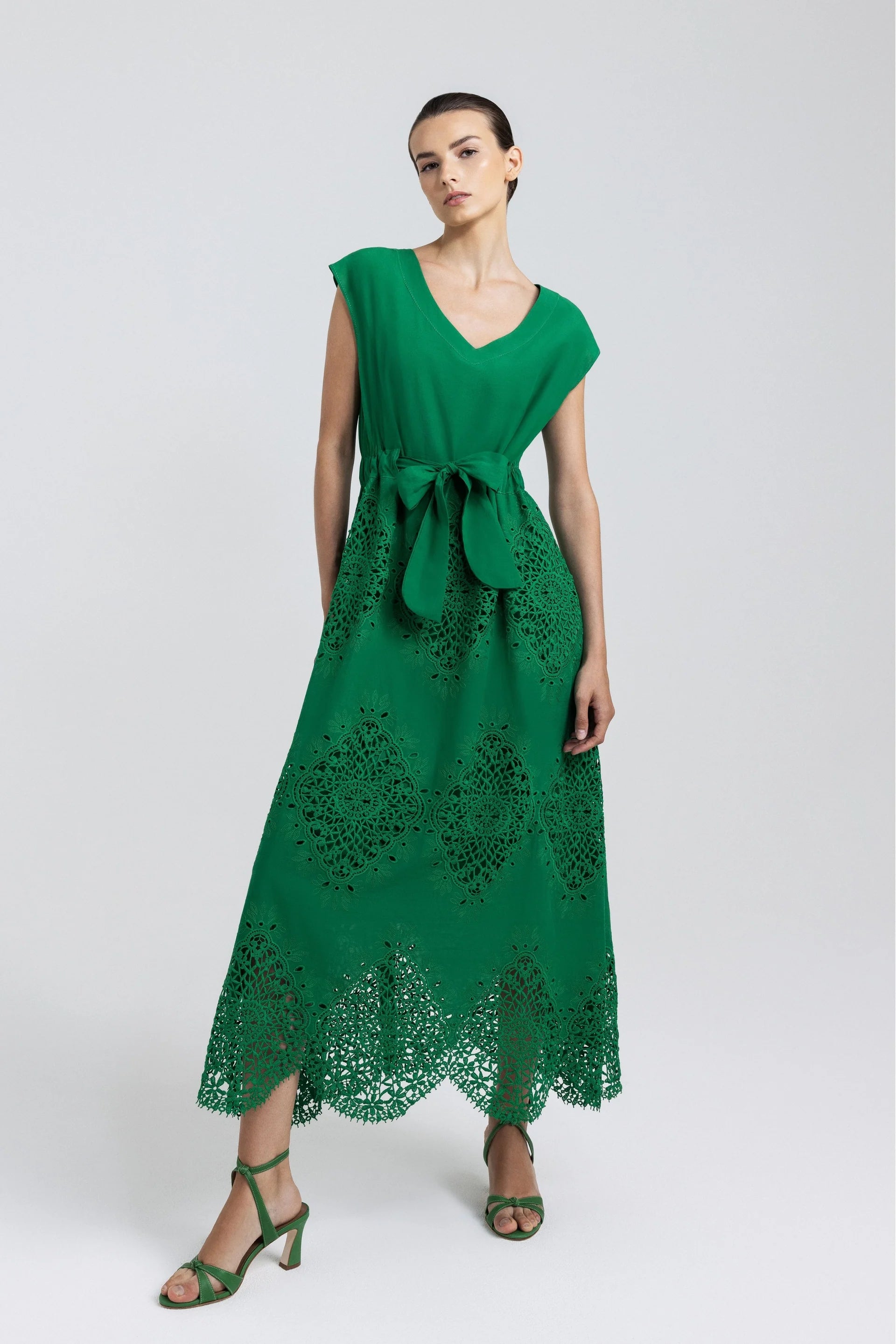 Meet SOFIA, a silhouette defined by quiet grandeur and effortless elegance. Crafted in a refined lace and woven cotton blend, this summer dress evokes a sense of timeless Italian sophistication. The fluid bodice with a soft V neckline falls naturally over the body, while the cinched waist, defined by a tie belt, shapes the silhouette with precision and ease.